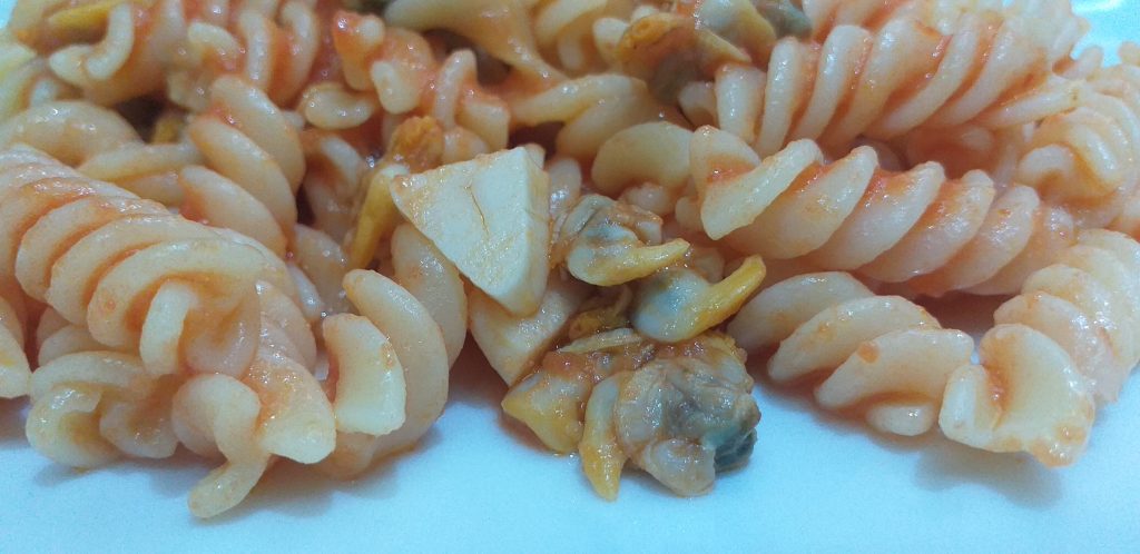 En un cazo con agua hirviendo, ponemos los 150gr de pasta, junto con un poco de sal y 1 hoja de laurel. Y dejamos cocer durante 10/15 minutos. A parte, doramos los 3 ajos fileteados ligeramente. Una vez los tenemos al punto, añadimos los 200gr. de tomate natural y el vino blanco. Y dejamos cocer cerca de 5 minutos. Mediante un colador, separamos los berberechos de su caldo. Y este caldo , pasados los 5 minutos de cocción, lo añadimos al cazo. Y dejamos que reduzca unos 5 minutos más. Ahora ya podemos añadir los berberechos y, solo nos queda colar la pasta y adjuntarlo todo. Le podemos dar un par de minutos todo junto, para que se amalgamen mejor los gustos y listo.