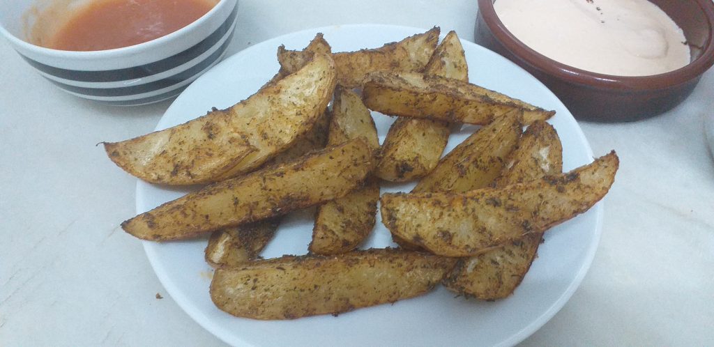4 Patatas 1 Cucharadita de Orégano 1 Cucharadita de Pimentón dulce 1 Cucharadita de Ajo en polvo 1 Cucharadita de Tomillo 1 Cucharadita de Pimienta Negra 1/2 Cucharadita de Pimentón Picante 1 Cucharadita de Perejil 1 Cucharadita de Comino Sal 6 Cucharadas de Aceite