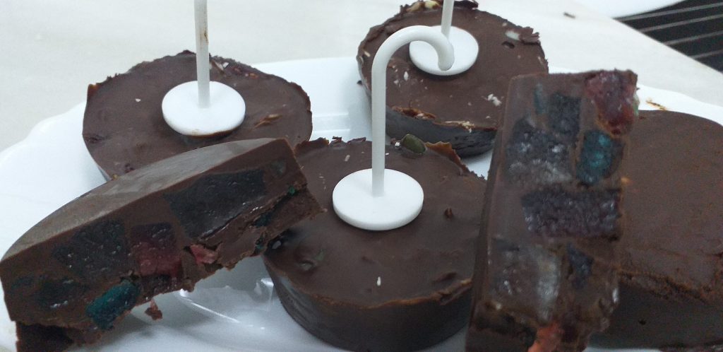 Ahora nos queda armar los bombones; a parte en una sartén derretimos 10gr de mantequilla y, una vez derretida adjuntamos 200gr de chocolate para fundir. Fundimos el chocolate junto con la mantequilla , al baño maría . Y lo pasamos a algún molde donde le podamos adjuntar los diferentes tipos de rellenos que hemos realizado. Nos queda porno en el refrigerador y listo.