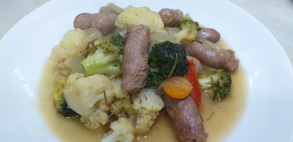 Tenemos 8 salchichas de cerdo cortadas por la mitad y las pondremos en un cazo con 2 o 3 cucharadas de aceite caliente. Le añadimos un poco de sal, a gusto, y también le añadimos un poco de pimienta a gusto. Mientras se van cociendo las salchichas, podemos cortar a trozos grandes 1 cebolla y, haremos los mismo con el trozo de pimiento rojo. Seguidamente pelaremos y cortaremos a trozos 2 ajos y, al mismo tiempo pelaremos y cortaremos a rodajas 1 zanahoria limpia. Añadiremos al cazo todas estas hortalizas que hemos cortado, junto con un poquito de sal En este momento añadimos 1 ramita de romero fresco. Taparemos y dejaremos cocer a fuego suave durante 5 minutos. Una vez han pasado estos 5 minutos, añadiremos 1 vaso de vino blanco. Mezclamos bien y dejaremos cocer a fuego suave durante 5 minutos más , tapado. Ya han pasado estos últimos 5 minutos y , ahora añadiremos 1 vaso de agua y, rectificaremos de sal. Dejaremos cocer a fuego suave durante 5 minutos más y, pasados estos 5 minutos añadiremos los trozos de coliflor y de brócoli. Ahora ya seguidamente solo nos queda dejar cocer 10 minutos más a fuego suave y tapado y ya tendremos preparado este delicioso plato de salchichas con verduritas.