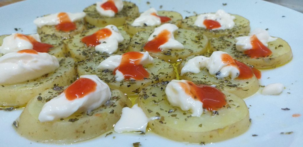 1 Patata Un poco de Orégano Un poco de Perejil Seco Sal Mahonesa Salsa Picante Aceite de Oliva