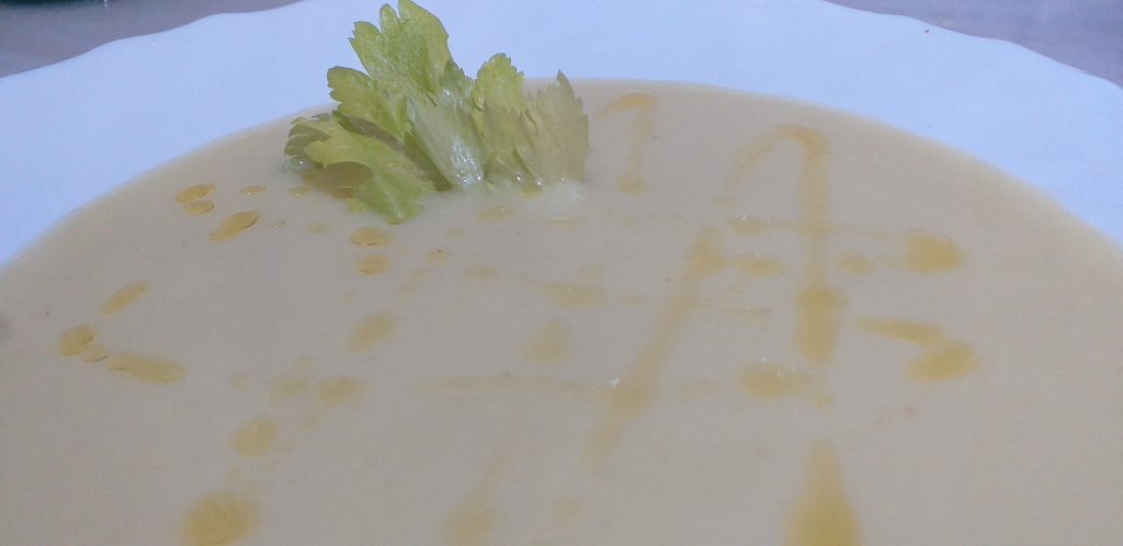 y para que quede una crema exquisita y suave al paladar lo paso por un colador y cocineras y cocineros del mundo ya podemos servir esta rica crema de apio la a decoramos con un hilo de aceite picante y unas hojitas de apio.