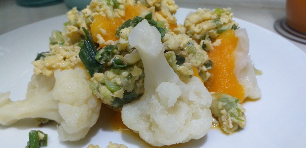 Ahora ya es el momento de emplatar : pondremos la coliflor, por encima crema de zanahoria que hemos echo y los ajos rehogados también por encima.