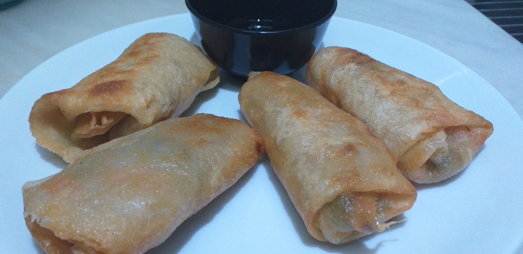 Seguidamente en una sartén con una ligera capa de aceite ponemos un cucharón de la masa de harina y vamos haciendo las masas de los rollitos. Como más finita nos pueda quedar, mucho mejor. Con estas cantidades salieron para 10 rollitos.